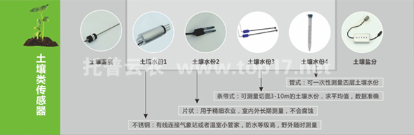 土壤熱通量傳感器,采用熱電堆測(cè)量溫度梯度,能廣泛用于測(cè)量土壤的能量平衡和土壤層的熱傳導(dǎo)率。土壤溫濕鹽三合一傳感器,能同時(shí)測(cè)量土壤溫度、濕度、水分三個(gè)參數(shù)。不銹鋼材質(zhì)土壤水分傳感器,其防水等級(jí)高,能在野外隨時(shí)隨地開展測(cè)量任務(wù)。管式水分傳感器,不同深度土壤參數(shù)同時(shí)監(jiān)測(cè),監(jiān)測(cè)深度最深達(dá)2米,可按需配置。