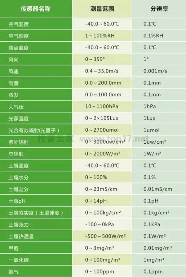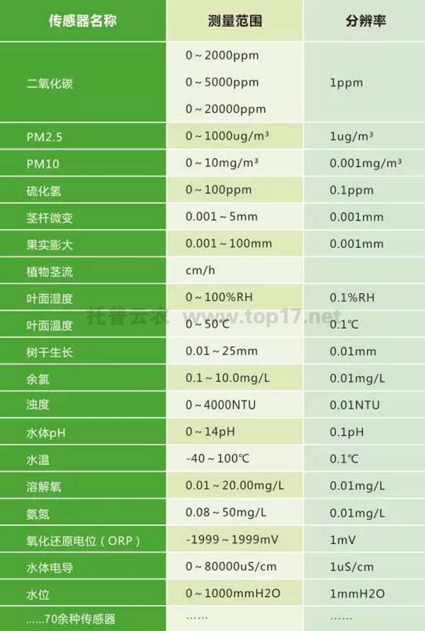 在農(nóng)業(yè)氣象方面,目前有空氣溫度、濕度、光照強(qiáng)度、光合有效輻射、二氧化碳、雨量、蒸發(fā)、風(fēng)速風(fēng)向、大氣壓、總輻射、紫外輻射等傳感器。同時(shí),還有應(yīng)用于畜禽養(yǎng)殖監(jiān)測(cè)的氨氣、硫化氫等傳感器,應(yīng)用于水質(zhì)監(jiān)測(cè)的pH、余氯、濁度、溶解氧、氨氮、水溫等傳感器,應(yīng)用于環(huán)境監(jiān)測(cè)的一氧化碳、二氧化碳、甲醛、PM2.5、PM10等傳感器。