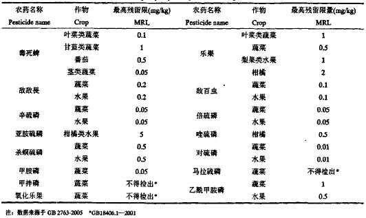 有機磷殺蟲劑有以下特點:藥效高,殺蟲譜廣;化學結構變化無窮,品種數量大。高效低毒品種已占領主流市場;化學性質不穩定,易水解、氧化、熱分解,易在自然條件下或在動植物體內降解;易在堿性條件下分解。下表列出了果蔬中常用有機磷農藥最大殘留限量(MPLs)。
