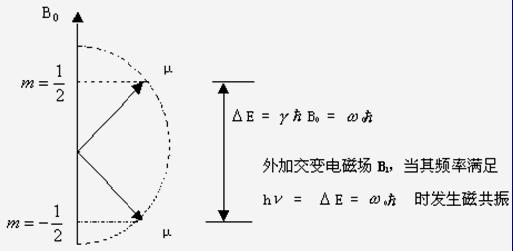 1H的自旋量子數是I=1/2,所以自旋磁量子數m=±1/2,即氫原子核在外磁場中應有兩種取向。1H的兩種取向代表了兩種不同的能級, 因此1H發生核磁共振的條件是必須使電磁波的輻射頻率等于1H的進動頻率。