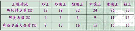 土壤水分是土壤中含有的水分,是農(nóng)作物水分的主要來源,是土壤的主要組成成分,同時也是水循環(huán)的重要環(huán)節(jié)。土壤水可以分為吸附水、毛管水和重力水。當土壤中的水分能被植物吸收時,被稱為有效水;不被植物吸收時,被稱為無效水。有效水是介于田間持水量和凋萎系數(shù)之間的一個值。具體見下表。