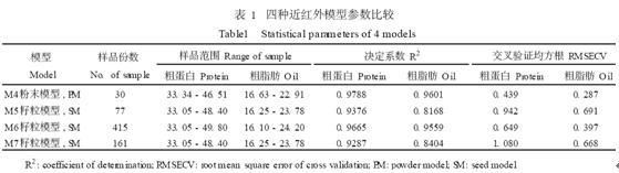 近紅外檢測模型建模樣品集樣品數量分別為30、77、415和161個(表1) 。其中,粉末模型樣品覆蓋范圍相對較窄,粗蛋白決定系數0. 9788,粗脂肪決定系數0. 9601,在4個模型中最大,交叉驗證均方根分別為粗蛋白0. 439,粗脂肪0. 287,在4個模型中最小。籽粒模型M6的樣品集中包括415份樣品,且粗蛋白和粗脂肪含量的樣品范圍在4個模型中最寬。它的粗蛋白和粗脂肪決定系數在3個籽粒模型中最大,交叉驗證均方根在3 個籽粒模型中最小。