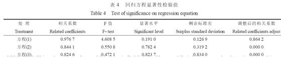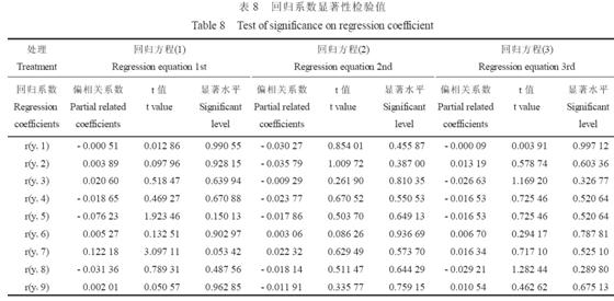 由一次項和二次項的偏回歸系數和t 值(表7、表8)可知, N、P、種植密度單因子與粗脂肪產量的關系, 在8 月11 日和9 月12 日收獲為密度(X3)>P(X2)>N(X1); 8 月26 日收獲為P(X2)>N(X1)> 密度(X3)。兩因子交互效應, 在8 月11 日和8 月26 日收獲為NP>N 密度>P 密度; 9 月12 日收獲為N 密度>NP>P 密度。
