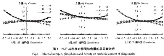 產量和品質是青貯型玉米品種兩個不可缺少的評價因素。青貯玉米的品質, 國內通常采用粗蛋白含量、粗脂肪含量、粗纖維含量、無氮浸出物和灰分含量等指標判斷飼料的營養品質。這種評價方法存在一定的缺欠。目前, 國際上通常根據營養成分、纖維素的類型和動物離體實驗等對青貯玉米品質進行劃分, 常用的指標有粗蛋白含量、淀粉含量、中性和酸性洗滌纖維含量、木質素含量、離體消化力和細胞壁消化力。其中粗蛋白含量可以通過蛋白質測定儀測定,粗脂肪可以通過粗脂肪測定儀來測定,而粗纖維也可以通過纖維測定儀來測出。栽培措施是影響青貯玉米產量和品質的重要因素。國內外研究結果表明, 施肥對玉米子粒的營養品質有顯著影響。在青貯玉米營養品質對密度與肥料的反應方面, 前人的研究尚不系統, 其機理尚不清楚。本試驗通過3 因素最優飽和設計, 研究N、P 與種植密度3 因素與不同收獲時期青貯玉米粗脂肪的關系, 并通過回歸模擬3 因子對青貯玉米粗脂肪含量及其產量的效應, 為實現青貯玉米高產優質栽培提供理論依據。