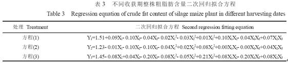 肥料和密度是青貯玉米獲得高產和優質的主要栽培措施。陳剛(1989)研究指出, 種植密度對玉米青貯飼料的干物質含量和脂肪含量有顯著影響。高密度下, 干物質含量和脂肪含量都比較高。在特定的生產條件下, 如果隨著種植密度增加飼草量繼續增加而消化率又不明顯下降, 那么較高的種植密度是必要的(Greg, 1998)。一般作為飼料種植的玉米要求田間留苗密度為75 000~90 000 株/hm2, 青貯玉米則要求留苗105 000~120 000 株/hm2(周風山, 1997)。本試驗研究建立了種植密度、施N 量和施P 量與不同收獲時期青貯玉米粗脂肪含量、產量的回歸模型。對各因子的效應分析結果表明, N、P 與密度是影響粗脂肪含量與產量的重要因子。隨著收獲期推遲, 密度與N 對粗脂肪含量的作用逐漸增強, P 的作用逐漸減弱。對粗脂肪產量的作用因不同收獲期而異。散粉期與乳熟期收獲表現為密度(X3)>P(X2)>N(X1); 灌漿期收獲表現為P(X2)>N(X1)> 密度(X3)。總的來說, 隨N、P 用量的增加, 青貯玉米整株粗脂肪的含量及產量均呈單峰曲線變化, 隨密度的增大則略呈下降趨勢。
