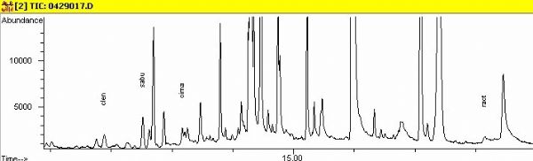 將上述盛有殘渣的具塞玻璃試管放入50℃烘箱中加熱片刻,除去水分后,加入甲苯100mL和雙三甲基硅基三氟乙酰胺(BSTFA)100mL,渦旋振蕩20s,密封玻璃塞,置于80℃恒溫烘箱中加熱1小時,冷卻后加入300mL甲苯,作為試樣溶液,供氣相色譜-質譜分析(色譜柱:DA-5MS, 30m×0.25mm×0.25µm,P/N:1525-3002)。
