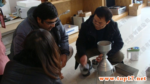 圖為:外國客戶親自動(dòng)手演示鐘鼎式分樣器,并不時(shí)提問