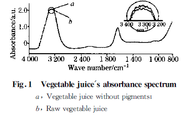 儀器參數設定:光譜采集范圍2 000 !200 cm-1 ,分辨率為1 cm-1 ,掃描次數為16 次。用濾紙過濾蔬菜汁,視過濾兩遍后顏色清澈的蔬菜汁不含色素。分別檢測蔬菜汁原汁及其經濾紙過濾后不含色素情況下的光譜。