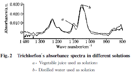 如圖2 所示。可見,敵百蟲的特征吸收峰位置在2 種溶劑中均能夠得到良好的反映。由常識可知,白菜葉片組織的絕大部分由水構成,因此農藥在蔬菜中的吸收應與在水溶液中的基本相同。實驗結果顯示,農藥敵百蟲在2 種溶劑中的吸收峰位置完全吻合;在蔬菜汁中的吸光度略低于在蒸餾水溶液中的,可能是未濾除的蔬菜纖維等雜質的吸收造成的影響。
