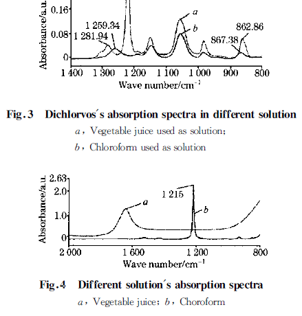 近似相同濃度(7 000(10 -6 ))的敵敵畏蔬菜汁溶液和氯仿溶液的吸光度數據如圖3 所示。由實驗結果可見,敵敵畏在蔬菜汁溶劑下的吸收峰位置能夠與中紅外的特征吸收一一對應( 見表1 ),而在氯仿溶劑下,1 259. 2 cm-1 處和863. 4cm-1 處的峰位置發(fā)生了偏移。這是由于溶劑氯仿的極性較強,其氫鍵影響了敵敵畏的基團吸收頻率,造成敵敵畏的吸收峰位置發(fā)生移動。此外,2 條吸光度曲線并不重合。這除了上述蔬菜中雜質吸收的原因外,分析2 種溶劑本身的透光能力可看到,蔬菜汁在1 400 !800 cm-1 波段(除1 215cm-1 附近外)的吸收比氯仿強許多(見圖4 )。因此扣除溶劑背景時,敵敵畏在蔬菜汁中的吸光度低于在氯仿中的吸光度。