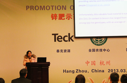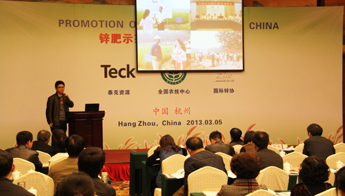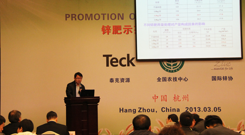 全國農技推廣中心節水處高祥照處長主持會議,全國農技推廣中心杭大鵬書記、浙江省農業廳陳利江副廳長、農業部種植業管理司王金等處長、浙江省農產品質量檢測中心黃國洋主任、加拿大泰克資源安德魯·格林教授、國際鋅協會樊明憲教授出席了會議開幕式并相繼發表了講話。全國農技推廣中心杭大鵬書記對2012年的節水工作所做出的成就表示肯定,并強調,在2013年要繼續強化土壤墑情監測工作,搞好鋅肥示范推廣工作,加大節水工作研究力度。