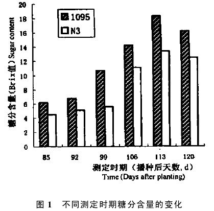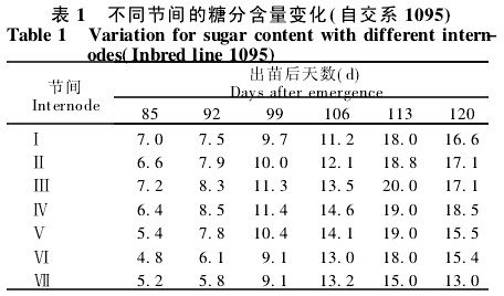 2.2 不同節(jié)間糖分含量的變化 就高糖系1095而言,一共7個節(jié)間,6個測定時期中的4個時期糖分含量最高值出現(xiàn)在第?節(jié)間,2個時期是第?節(jié)間的含糖量最高(表1)。就低糖系N3來說,情況與高糖系1095相比,略有不同。親本N3共有6個節(jié)間,6個測定時期中的4個時期是第?節(jié)間含糖量最高,g個時期(106 d)是第?節(jié)間含糖量最高,另一個時期(99 d)是第?節(jié)間含糖量最高。據(jù)此,作者認為高粱莖稈中糖分含量最高的節(jié)間應(yīng)該是中部節(jié)間或上一節(jié)間,這將給準確測定高粱莖稈中糖分含量提供理論依據(jù)。