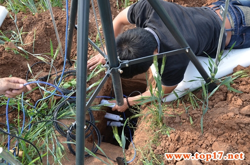 圖為:托普儀器技術人員現場安裝土壤水分溫度定點檢測及遠程傳輸系統