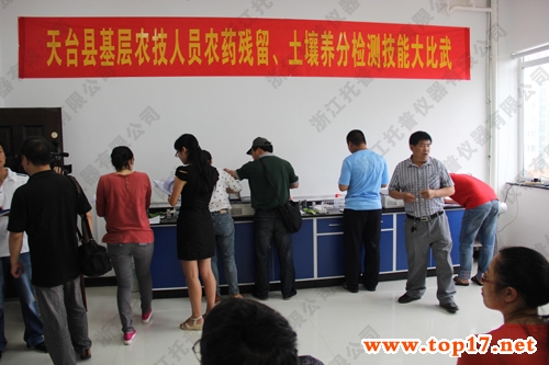 2013年6月7日,在天臺(tái)縣農(nóng)業(yè)局新農(nóng)技大樓里舉行了一場(chǎng)別開生面的比賽:農(nóng)藥殘留、土壤養(yǎng)分檢測(cè)技能大比武。徐志恒參加會(huì)議,天臺(tái)縣農(nóng)業(yè)局科長(zhǎng)參賽人員為來自天臺(tái)縣各個(gè)鄉(xiāng)鎮(zhèn)的基層農(nóng)技工作人員以及天臺(tái)縣部分農(nóng)業(yè)企業(yè)的農(nóng)殘檢測(cè)員共計(jì)三十人。托普儀器作為儀器提供商,派技術(shù)人員對(duì)現(xiàn)場(chǎng)戰(zhàn)況做出了評(píng)定。