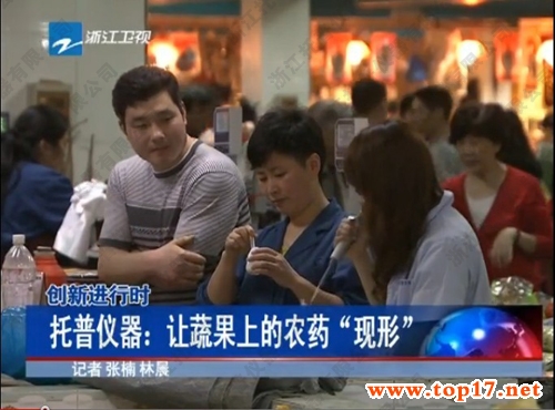 圖為:浙江新聞聯(lián)播報(bào)道正在檢測(cè)農(nóng)殘的攤主
