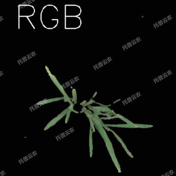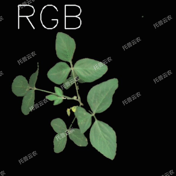 可見光二維成像單元:獲取植株側視可見光圖像,并利用人工智能算法分析獲取株高、葉頂點數(shù)、投影面積等形態(tài)參數(shù),黃色投影面積、綠色投影面積等顏色參數(shù),以及平滑度等紋理參數(shù),用于植株株型與健康狀態(tài)相關表型分析。