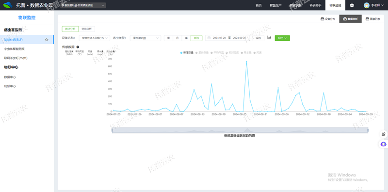 3、AI識別計數,實時監測:AI識別番茄潛葉蛾,自動計數,準確率高達95%以上,自動生成番茄潛葉蛾發生趨勢圖。