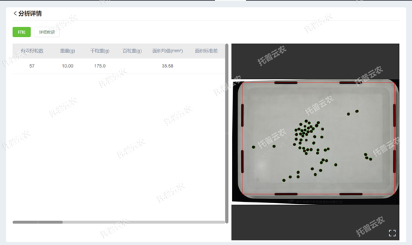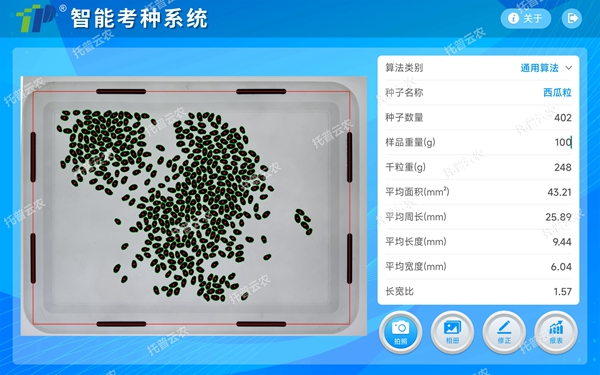 水稻考種系統適用于水稻種子考種分析,也適用于水稻、小麥、玉米、油菜、豆類、花生、芝麻、高粱等脫粒后的各種作物種子,可測量各種表面光滑的籽粒的數量、千/百粒重與平均粒型(包括長、寬、長寬比、周長、面積)。