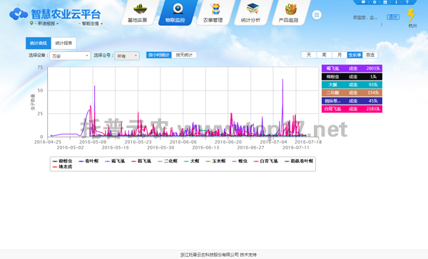 作物重大病蟲害數字化監測預警系統通過搭建在田間的智能蟲情監測設備,可以無公害誘捕殺蟲,綠色環保,同時利用GPRS/3G移動無線網路,定時采集現場圖像,自動上傳到遠端的物聯網監控服務平臺,工作人員可隨時遠程了解田間蟲情情況與變化,制定防治措施。通過系統設置或遠程設置后自動拍照將現場拍攝的圖片無線發送至監測平臺,平臺自動記錄每天采集數據,形成蟲害數據庫,可以各種圖表、列表形式展現給農業專家進行遠程診斷。