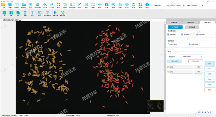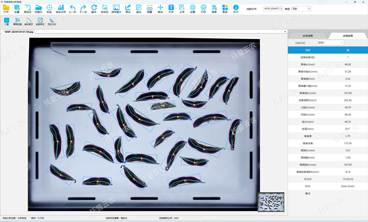 14.智能對比:能精準顯示種粒外接矩形,對不同品種的種子進行長和寬的對比,并輸出排列、對比圖。深度學習:根據顏色或是形狀的不同對種子進行自學習和再學習,并實現自動分類識別。