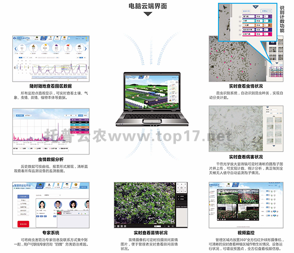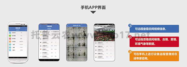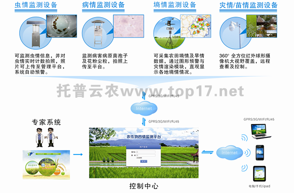 系統集成病蟲害及環境監測設備,可在WEB端或手機APP端遠程實時在線查看監測區域環境、蟲情、病害信息,并提供專家指導。